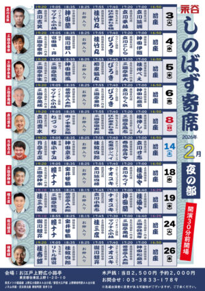 2月26日(木) <東京公演> しのばず寄席 夜の部 開演:17時(開場:16時半) 出演:前座・神田松麻呂・昔昔亭A太郎・ナオユキ・瀧川鯉昇 中入り 桂紋四郎・リトル清原・桂春蝶 会場:お江戸上野広小路亭(上野広小路駅A4出口前) 料金:当日2500円/予約2000円 ※急遽出演者に変更がある可能性がございます。 お問合せ:03-3833-1789