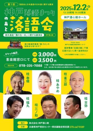 12月2日(火) <神戸公演> 神戸落語まつりのあと落語会 開演:14時(開場:13時半) 落語会と日本遺産の日本酒に関する講演 講演:神戸酒心館 歴史遺産「灘の生一本」に関する講演会 落語:桂雀三郎・桂あやめ・桂春蝶・桂吉弥・桂三ノ助・桂福丸 会場:神戸酒心館ホール 阪神電車「石屋川駅」下車徒歩8分 料金:前売3000円/当日3500円 お問合せ先:喜楽館窓口078-335-7088 協力:株式会社 神戸酒心館 主催:兵庫県神戸県民センター県民躍動室県民課 078-647-9089 2